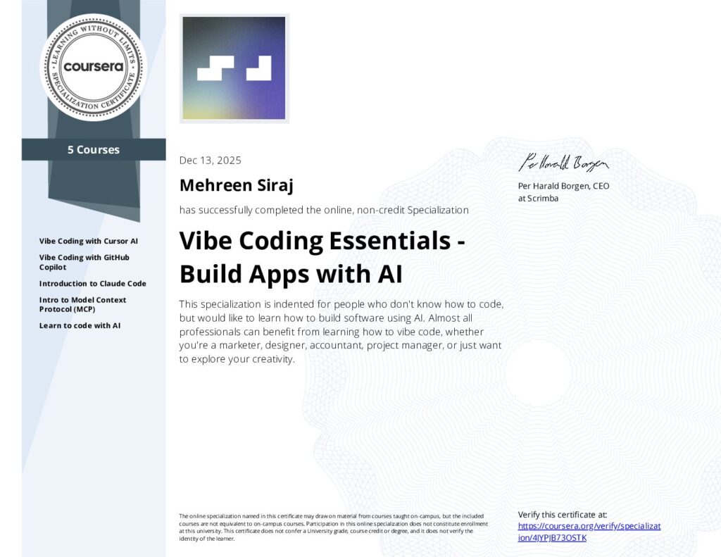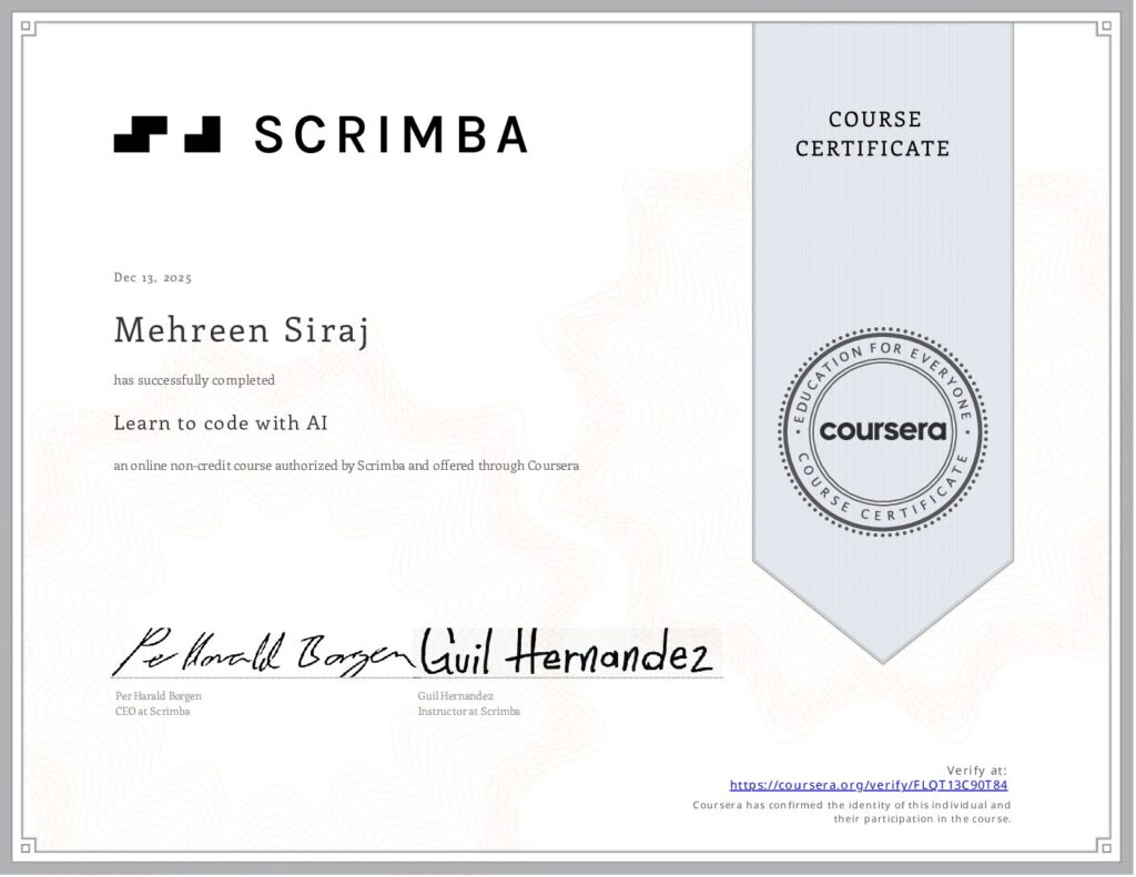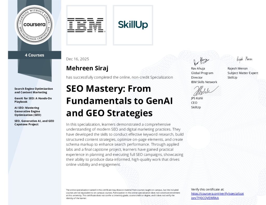 From SEO to AI automation and n8n workflows, explore the certifications that shape Mehreen Siraj’s digital expertise. 100+ completed courses and counting.